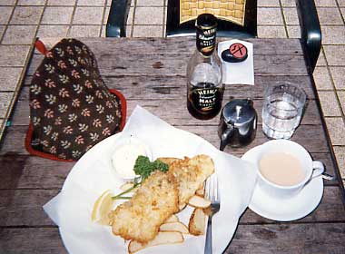 〔日比谷茶廊 Hibiya Saroh〕の紅茶とフィッシュ&チップス。